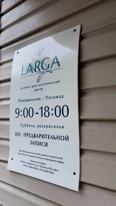 ООО "Дальневосточный учебно-диагностический центр дополнительного профессионального образования "Ларга" ИНН 2543175102 ОГРН 1232500011336 Юридический и фактический адрес: 690089, край Приморский, г. Владивосток, ул. Шошина, 25А, оф. 1