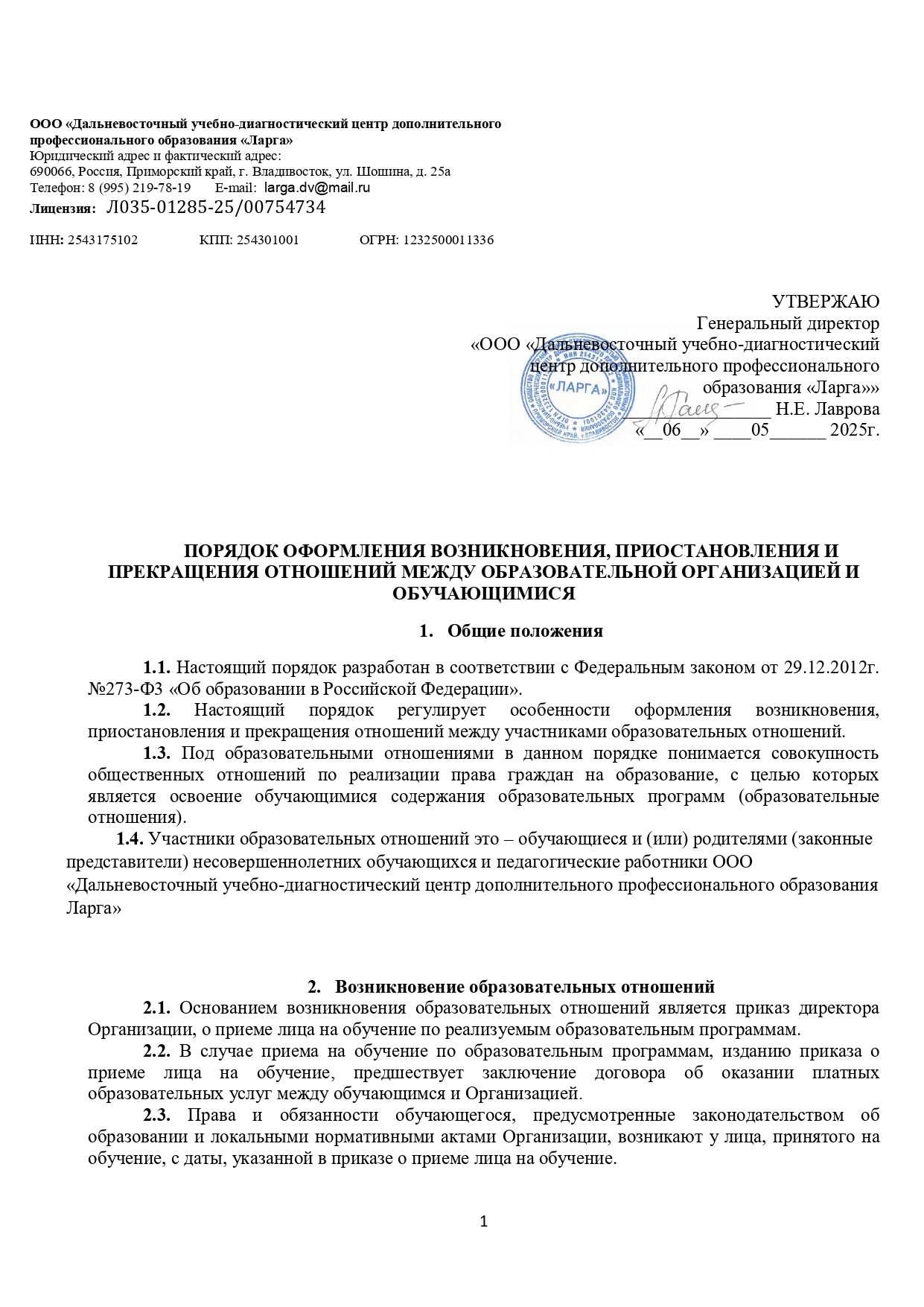 Порядок оформления возникновения, приостановления и прекращения отношений между образовательной организацией и обучающимися и (или) родителями (законными представителями) несовершеннолетних обучающихся